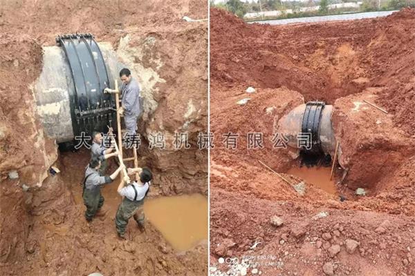 福建東南水務DN2200的球墨鑄鐵管發(fā)生泄漏,漏點在承插口處,由于安裝鑄管的時候因為地基下沉造成唇口泄漏,管道有20~50mm的變形,此處管道為主管道,不能停水,使用4片的2米2 的承插口管道修補器進行修復,1小時完成安裝,不再泄漏。