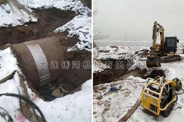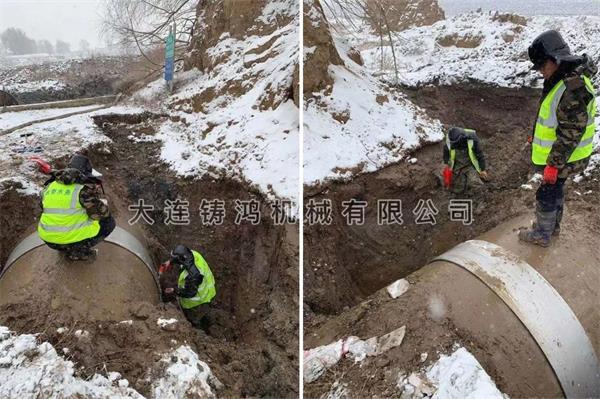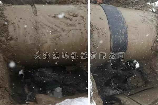內(nèi)蒙水務(wù)DN1600mm的水泥管道(外徑1926mm)發(fā)生破裂,破損管道東側(cè)還有一趟雨水管道,開挖難度大,使用鑄鴻雙卡管道修補器進行快速修復(fù)。