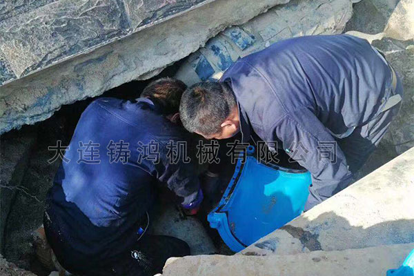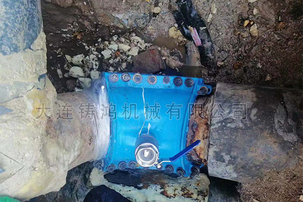 大石橋熱力公司DN250球墨鑄鐵管彎頭處底部發(fā)生泄露,面有腐蝕,工況緊急,現(xiàn)場不能停水,現(xiàn)場施工作業(yè)面積狹窄,管道和管道之間距離離得比較近,因?yàn)檎倒┡冢允褂描T鴻全包彎頭修補(bǔ)器快速修補(bǔ)該處漏點(diǎn)。