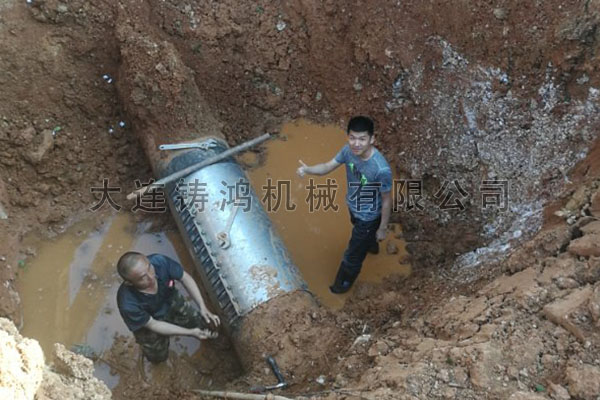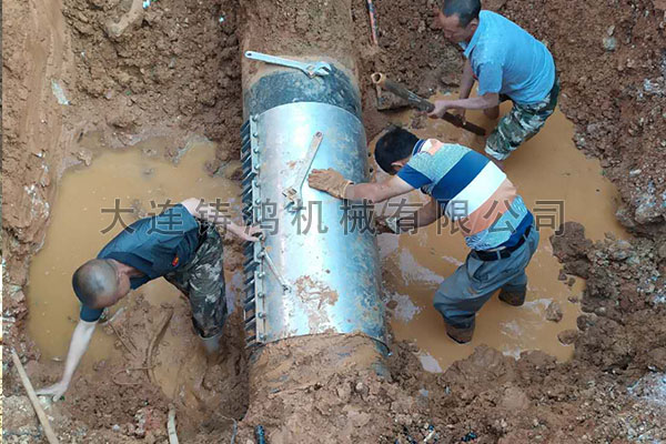 云南曲靖水務(wù)dn600的球墨鑄鐵管道發(fā)生泄漏,管道被擠壓變形,變形長(zhǎng)度有60多公分,漏點(diǎn)長(zhǎng)度有40多公分,壓力12公斤左右,使用一米二長(zhǎng)的板式修補(bǔ)器進(jìn)行修復(fù),不到一個(gè)小時(shí)就安裝成功。