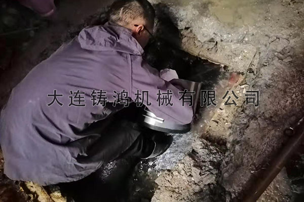 此管道外徑為219mm,原先使用鑄鐵哈夫節(jié)進行修補,但是周邊出現(xiàn)泄漏,現(xiàn)在把鑄鐵哈夫節(jié)拿掉。使用鑄鴻萬能片無限延長修補器進行一次性整體修復(fù),三片219mm的修補器進行搭接,半個小時安裝完畢。