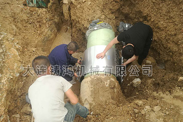 大連某工地玻璃鋼污水管道在施工過程中讓挖掘機把管道挖壞,施工現(xiàn)場環(huán)境全是水,所以先進行排水作業(yè),清除污水后,發(fā)現(xiàn)620玻璃鋼管發(fā)生泄漏,漏點漏洞有將近一拳頭大,根據(jù)現(xiàn)場工況,傳統(tǒng)修補方式必須停水停壓,晾干,沾糊,現(xiàn)場不能停水停壓,使用鑄鴻板式修補器615-635規(guī)格進行快速帶壓修補,用時8分鐘完成修復,現(xiàn)場領導非常滿意。(修補前)(修補中)(修復后)