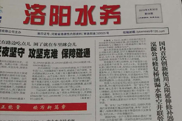 洛陽橋涵426球鐵架空管道泄露,裂縫從承插口斜面喇叭口位置一直到直管段,裂縫長達3.2米并有空間限制,采用無限延長修補器2個1米長,1個1.2米,1個承插口修補器,產(chǎn)品總長度3.6米,將承插口修補器一邊卡在插口管道,另一邊卡在承口這邊的修補器上,產(chǎn)品安裝靈活,操作方便,現(xiàn)已通水,搶修非常成功,由于工況特殊各級領(lǐng)導(dǎo)都非常關(guān)注,此工況得到水司領(lǐng)導(dǎo)的一致好評!并在洛陽水務(wù)報刊登報道,洛陽領(lǐng)導(dǎo)已將此工況上報中國水務(wù)報。