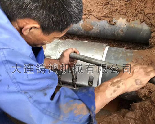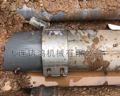 廣東佛山施工現(xiàn)場非標(biāo)280管中間發(fā)生斷裂,由于漏點(diǎn)較大,修復(fù)起來較為困難,施工人員決定切斷破損管處采用一段新管進(jìn)行連接,由于備貨庫存里沒有相同的管材,于是用了一段鋼管,使用“鑄鴻”雙卡管道連接器進(jìn)行快速連接。