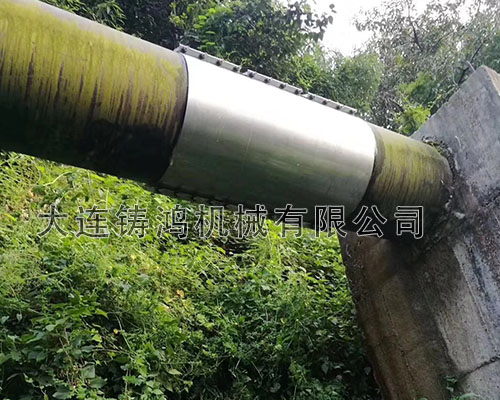 DN600的球墨鑄鐵管道被落石砸中,管道發(fā)生泄漏并在漏點處伴有嚴重的管道變形,長度達800mm,由于是架空管道,管離地面8米左右,所以需要采取較為方便的修補方式,降低作業(yè)的危險性,最終選擇了“鑄鴻”板式修補器進行快速修復,降低作業(yè)難度。